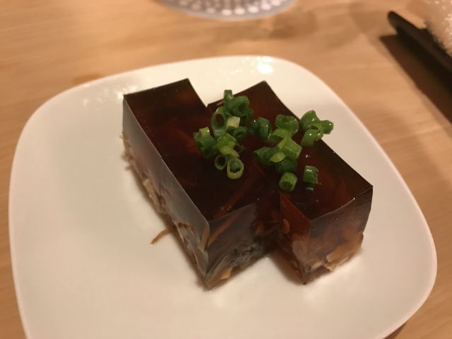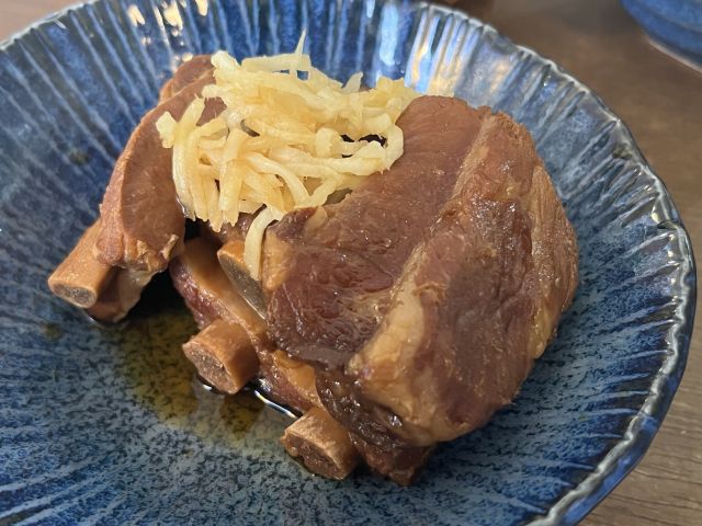 羅火腿というのは、”豚の三枚肉(ばら肉)またはもも肉の角切りを、泡盛・醤油・砂糖などで味付けして煮込んだ料理のこと”。