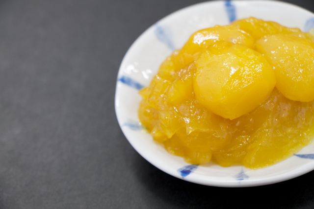 柚餅子というのは、”柚子(ユズ)の果実をくり抜いて、その中に糯米(もちごめ)・味噌・醤油・砂糖・胡桃(クルミ)などを混ぜたものを詰め、蒸して乾燥させた食品のこと/米粉・小麦粉・砂糖・味噌などを混ぜ、それに柚子の果汁や皮を加えて捏(こ)ねて蒸したお菓子のこと”。