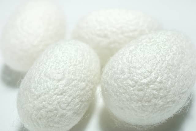 蚕の繭から繊維をとる前に、煮沸することで繭から繊維をとりやすくするため、このときに繭の中にいる蚕のさなぎは死んでしまいます。